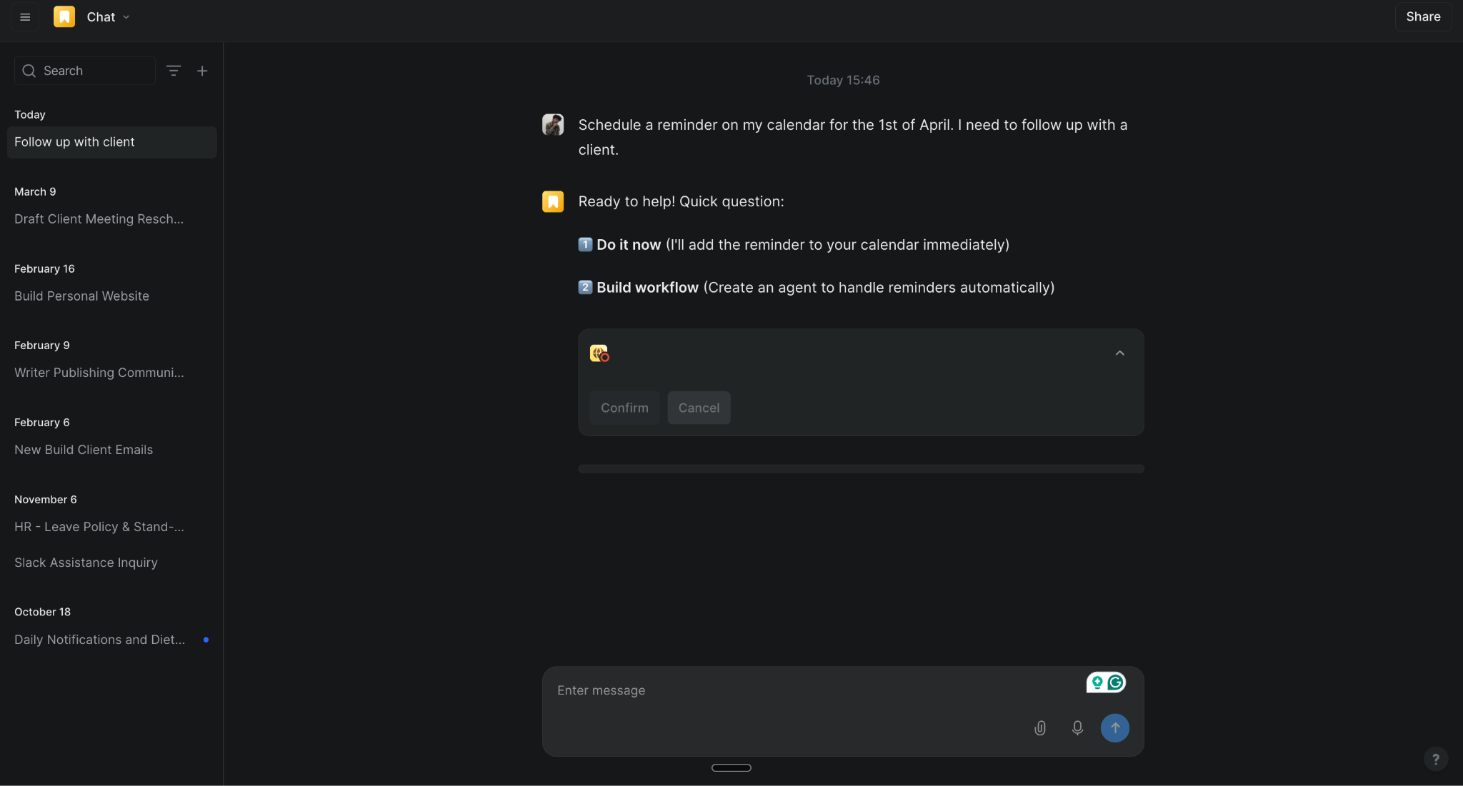 Then there’s a workflow builder that works from your SOPs and a search assistant that finds anything across your entire workspace instantly. Your calendar is just where it all lands.