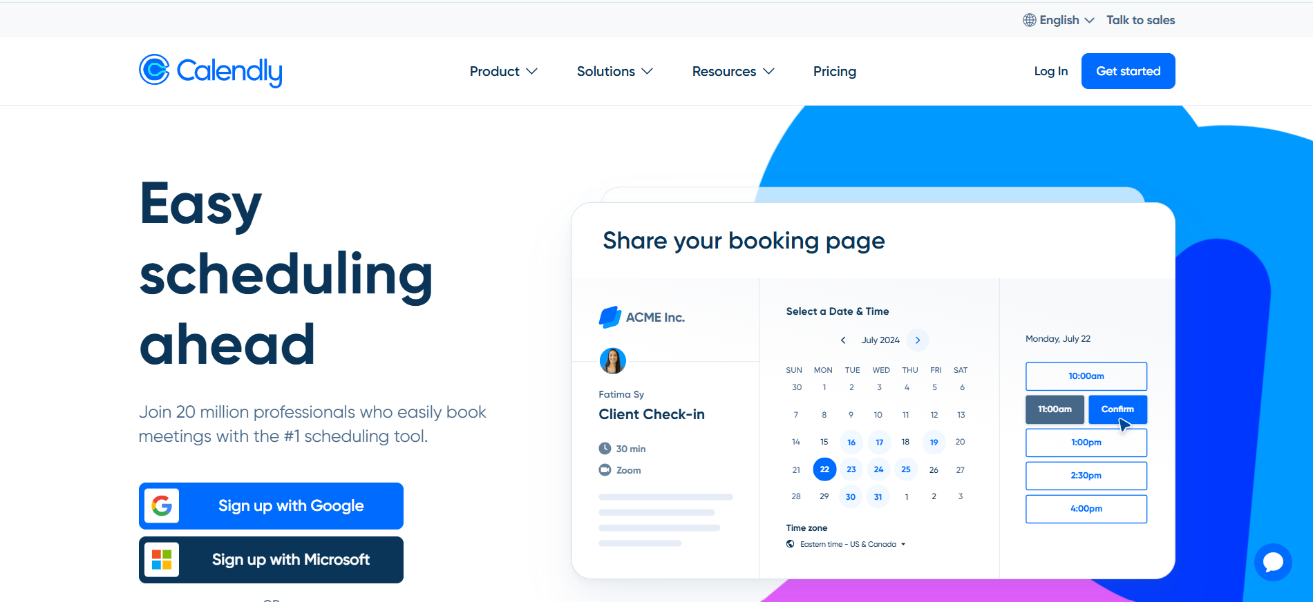 It syncs with Google, Outlook, and Office 365, detects time zones automatically, and sends confirmation emails and reminders once a slot is booked.