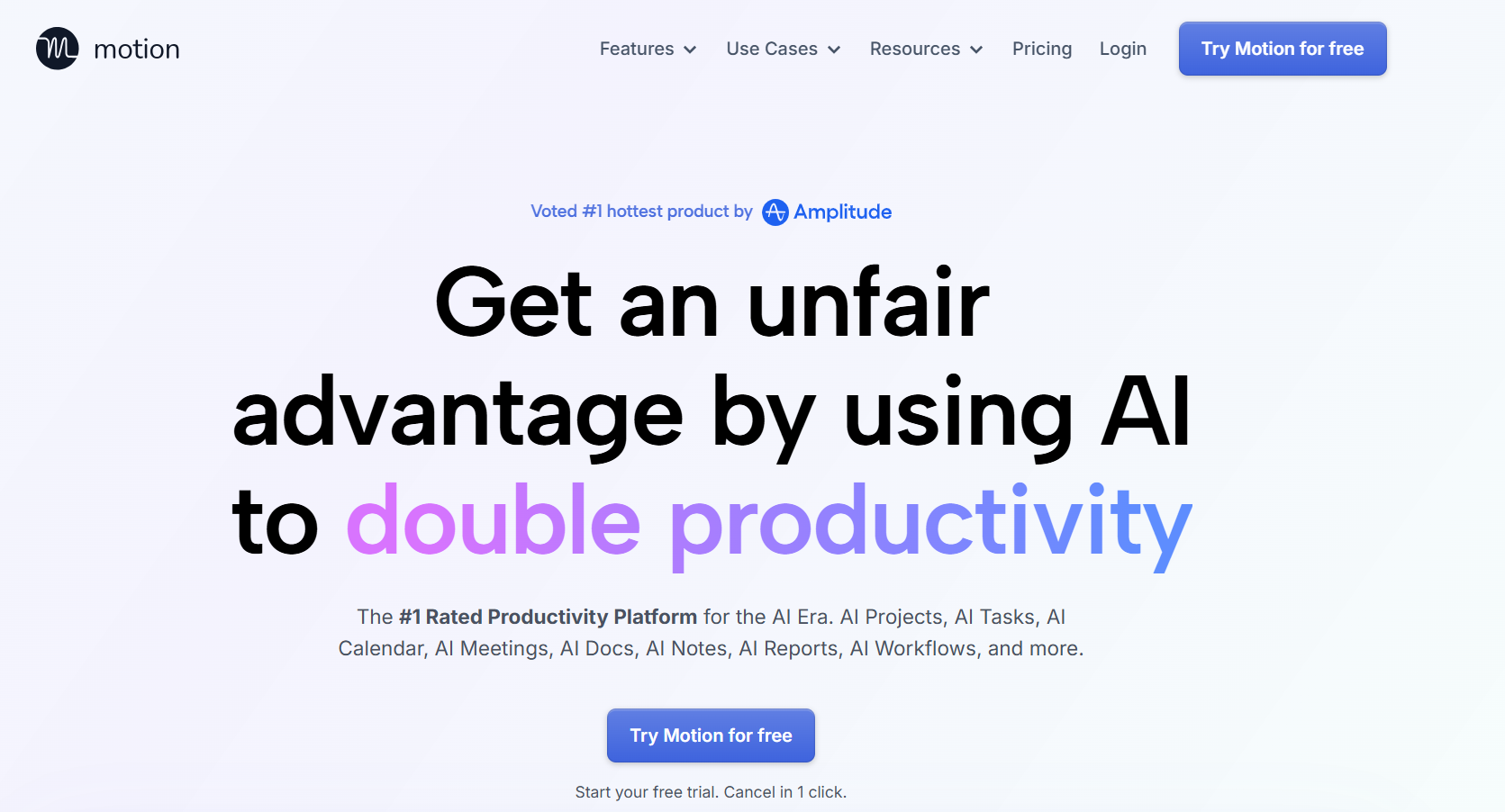 Motion has been consistently integrating AI with its different tools. There's an AI planner for your tasks, a project manager that generates and tracks projects automatically, a meeting notetaker, and a docs assistant that drafts and proofreads.