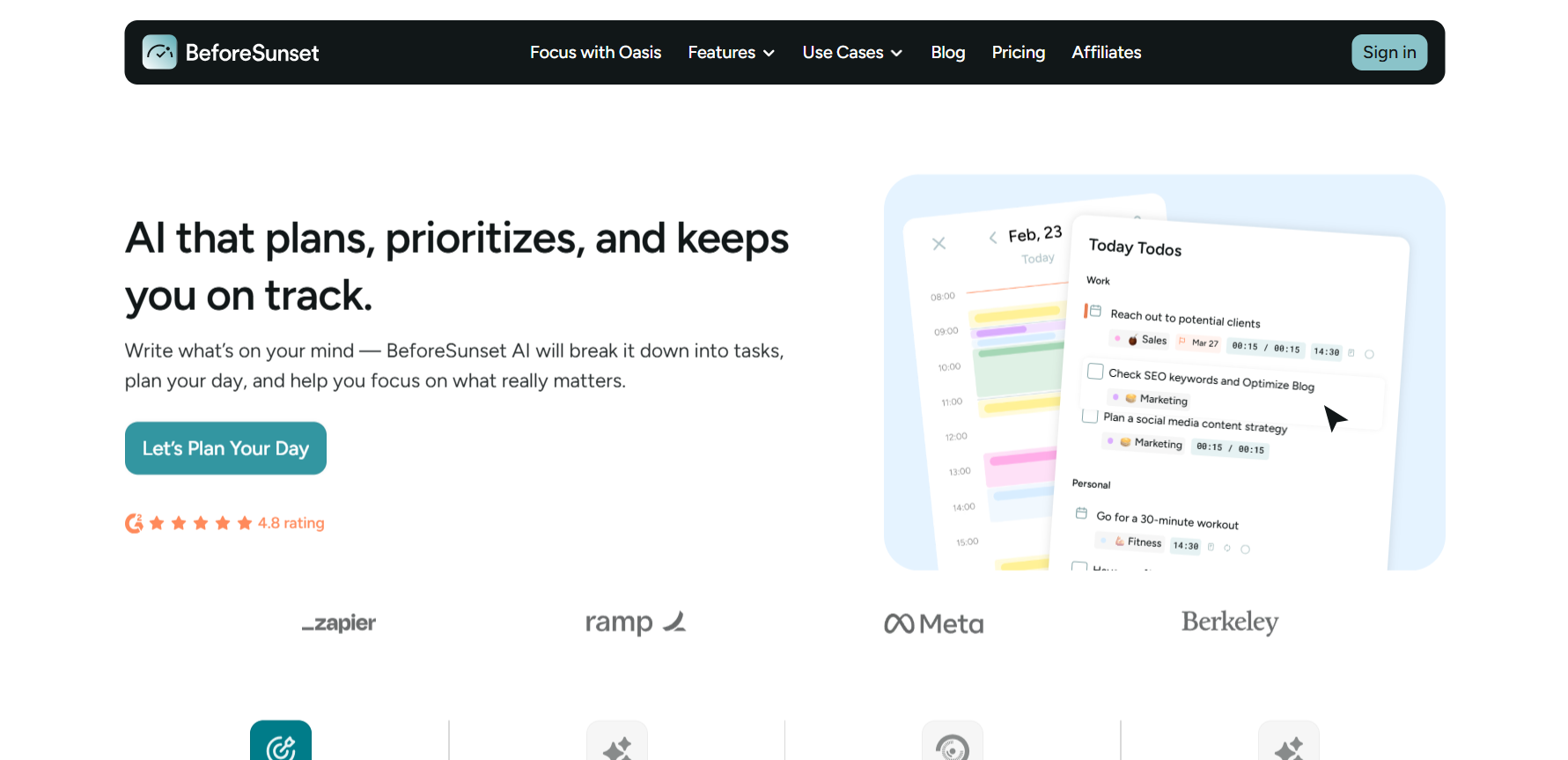 What it does: BeforeSunset helps you plan your day by organizing tasks and priorities. It turns them into a simple schedule so your day feels more structured.