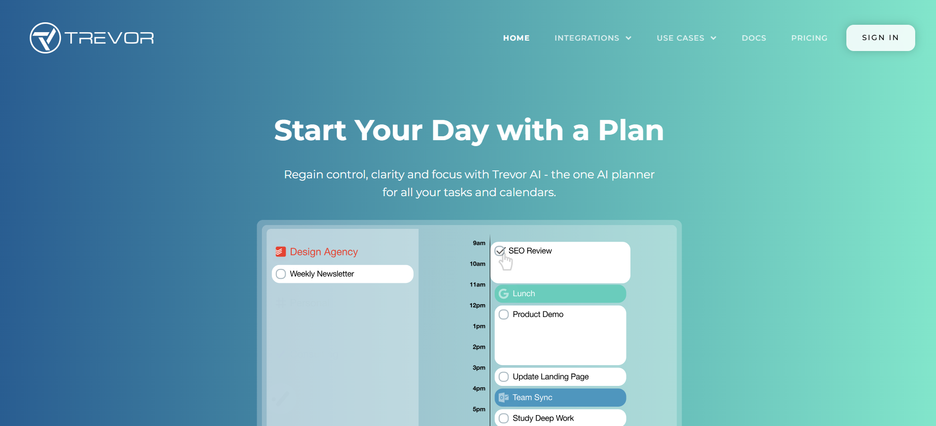 What it does: Trevor AI connects your tasks to your calendar so they turn into scheduled work time instead of just sitting in a list.