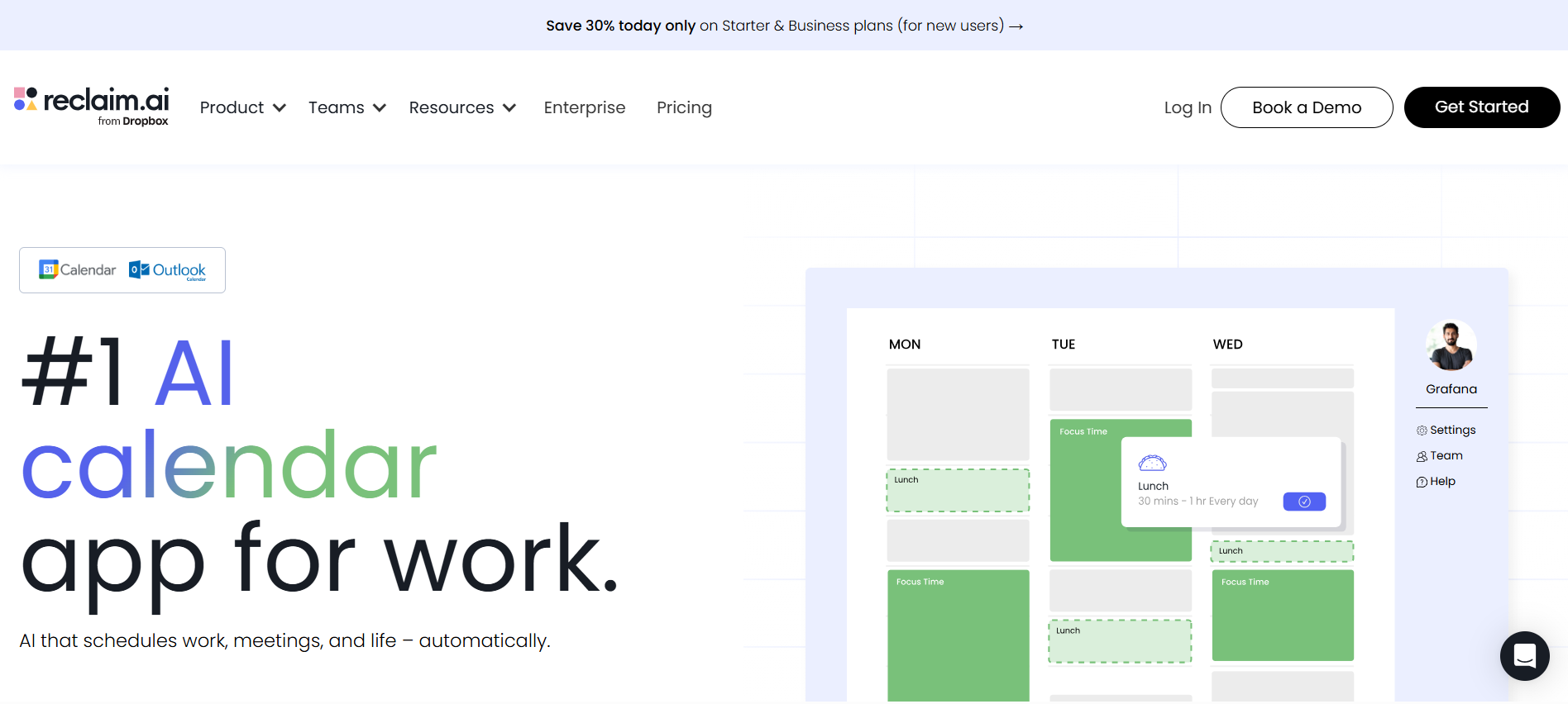 Reclaim has a free Lite plan for calendar basics. The Starter plan costs $12/seat/month for small teams, and the Business plan is $18/seat/month for larger ones.