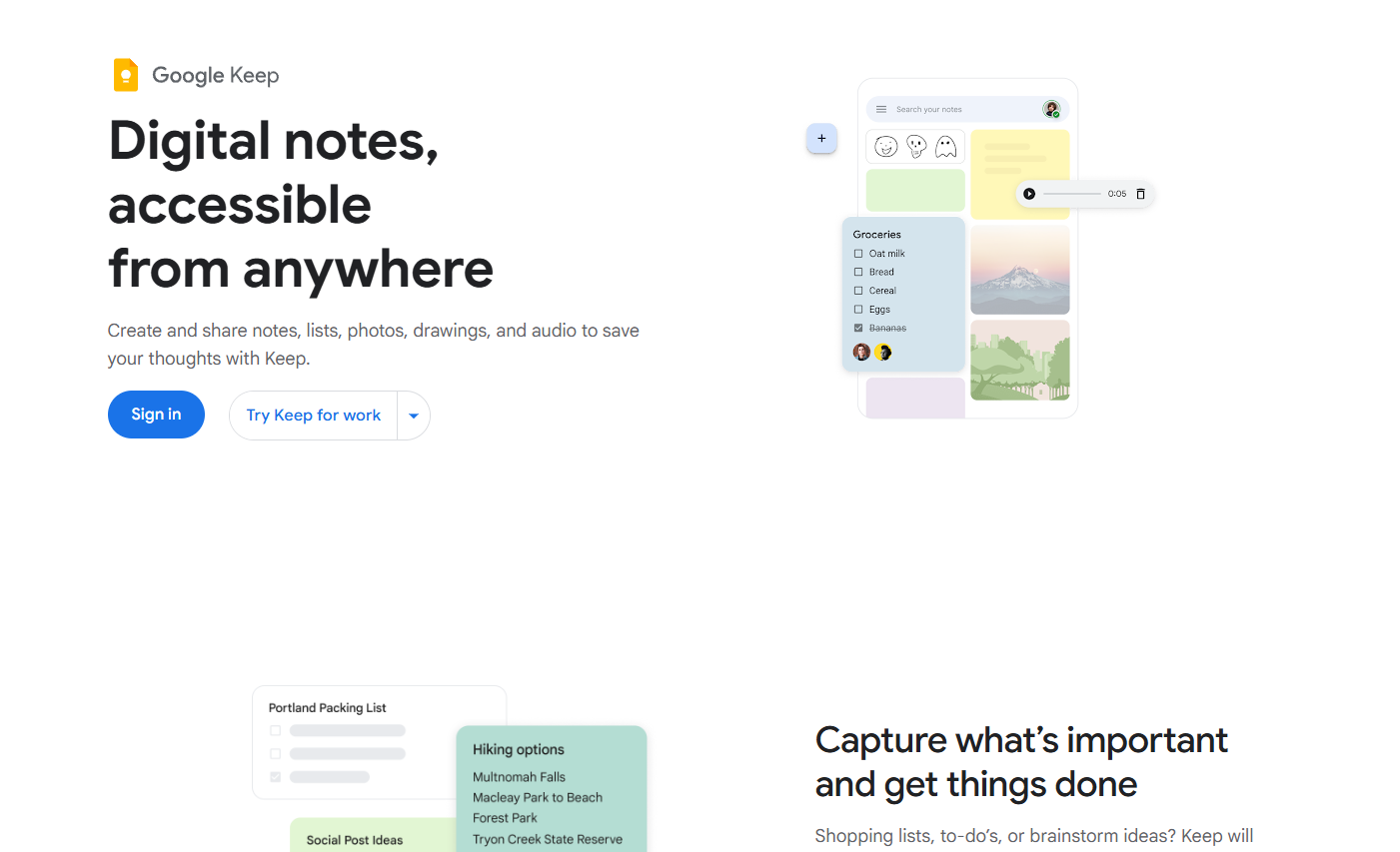 Google Keep lets you create color-coded notes, checklists, and voice memos that sync instantly across all your devices. You can label, pin, or share notes with teammates and set time- or location-based reminders.