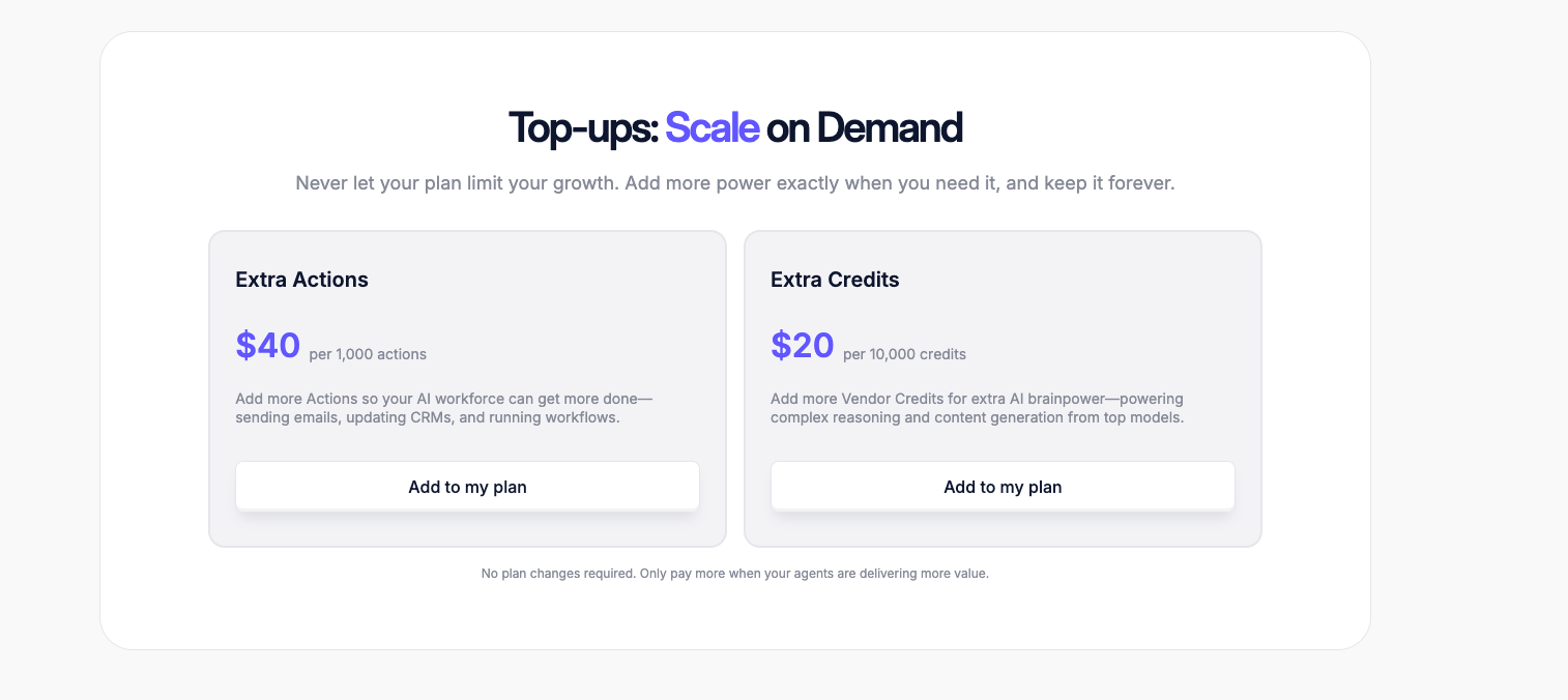 Relevance AI can be expensive once your usage grows. If you run out of included usage, you may need top-ups instead of just staying on the same plan. Relevance AI sells extra Actions and Credits as add-ons, which is useful, but it can make the monthly spend less predictable.